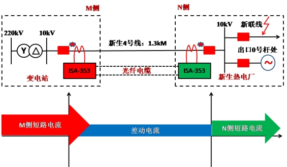 2007年8月5日某220kV變電站10kV重生4號線光纖分相電流差動(dòng)維護(hù)動(dòng)作,開關(guān)跳閘,經(jīng)巡線人員查看、故障點(diǎn)在新聯(lián)線出口0號桿處維護(hù)人員查看兩邊維護(hù)安裝,模仿區(qū)內(nèi)外故障維護(hù)均反響正確,如下圖所示,試分析跳閘緣由。