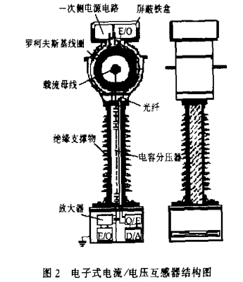 電流互感器設(shè)備由電流檢測單元和電壓檢測單元兩部分組成。前者選用羅柯夫斯基線圈作為電流傳感器,有源電子器件結(jié)束信號的數(shù)宇調(diào)制;后者選用電容分壓器作為電壓傳感器。高壓端電子線路電源由一個輔助電源感應線圈直接從母線上獲取。羅氏線圈和電源感應線圈安裝在母線上。高壓端信號調(diào)制和電源調(diào)度電路板置于·一個鐵磁屏蔽盒中,電流信號在高壓端經(jīng)AD轉(zhuǎn)化、E/O轉(zhuǎn)化后調(diào)制成光信號,經(jīng)過光纖傳送到低電位端。依據(jù)需求,可以將信號繼續(xù)用光纖傳送到遠方的控制室,也可以就地經(jīng)O/E、D/A轉(zhuǎn)化,放大成仿照電流信號,母線電壓經(jīng)電容分壓器轉(zhuǎn)化成低壓信號后,調(diào)制成光信號,經(jīng)光纖傳送到控制室,也可以就地經(jīng)校準、溫度補償后,給出仿照電壓信號、一個陶瓷套管既用作高壓部分元件的絕緣支撐,一起又是傳輸電流信號的光纖和電容分壓器的通道。